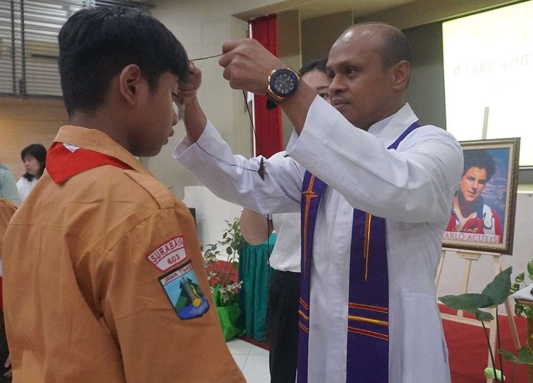 Surabaya, Kampus Ursulin—Sanmaris, Pada tanggal 12 Desember 2025, SMP Santa Maria menerima kehadiran relikui Santo Carlo Acutis untuk diperkenalkan kepada para siswa/siswi mengenai kekudusannya melalui rangkaian ibadat penghormatan yang dilaksanakan di aula lantai 4.