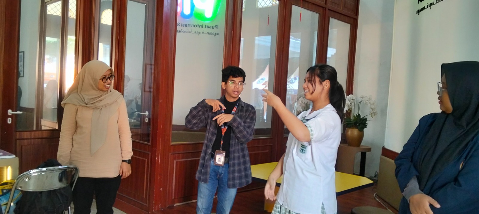 Setelah kami melakukan tur keliling perpustakaan dipandu oleh Kak Mila, kami dipersilakan duduk di tempat yang telah disediakan. Kami diperkenalkan dengan beberapa mahasiswa UNS yang turut membantu kegiatan kunjungan serta administrasi perpustakaan, salah duanya adalah kak Windha dan kak Salsa yang mengajak kami bermain sebuah permainan. Kami diajak bermain permainan kata berantai dimana terdapat 3 kelompok dengan masing - masing kelompok diisi oleh 3 orang. Orang pertama harus membaca sambil menghafalkan kalimat yang dirancang rumit, contohnya “Kakatua kakak kakekku kenal kakak tua kakak kakekmu” dan sebagainya. Selain seru, permainan ini juga mengajarkan nilai hidup cinta dan belas kasih yang ditunjukkan ketika kami harus bekerja sama serta nilai totalitas ketika kami bekerja keras dalam menghafal seluruh isi kalimat.