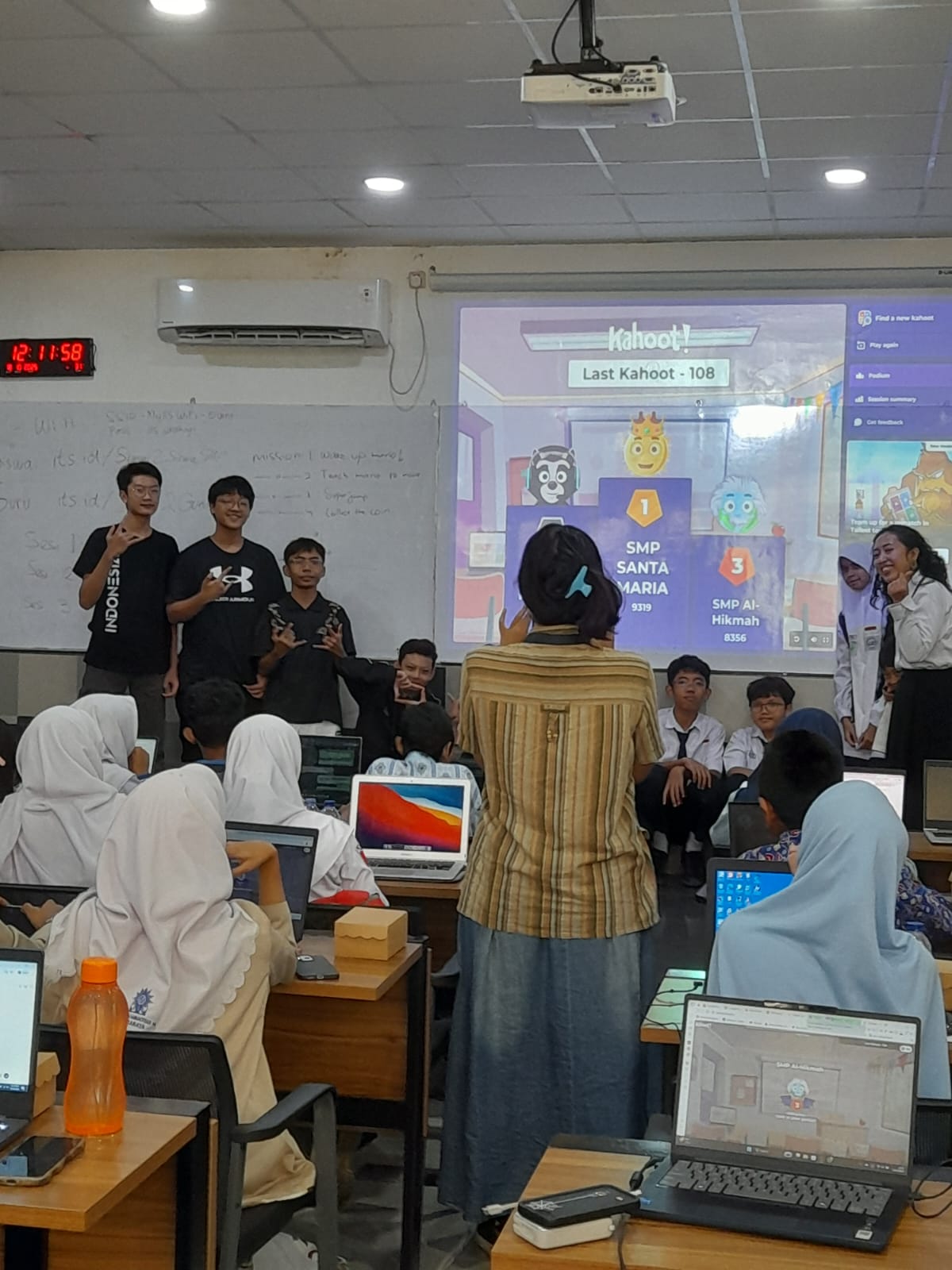 Dalam sesi pertama ini, beliau mengajukan beberapa pertanyaan reflektif kepada peserta workshop seperti seberapa sering menggunakan AI, AI yang sering dipakai, tujuan menggunakan AI, dan pertanyaan - pertanyaan sejenisnya lewat platform menti. Banyak siswa mengaku bahwa mereka menggunakan AI kadang untuk mengerjakan tugas sekolah atau bahkan mengerjakan ujian. Untuk menanggapi hal ini, Pak Dito menyampaikan kekhawatirannya terhadap minimnya etika dalam penggunaan AI khususnya dalam pembelajaran disekolah. Kemudian beliau menjabarkan materi tentang bagaimana menggunakan AI secara beretika. Di akhir sesi, diadakan quiz dengan platform kahoot untuk menguji pemahaman siswa akan materi ini. Di quiz ini, tim SMP Santa Maria berhasil meraih posisi ke 2 di antara seluruh tim partisipan. Setelah itu, peserta dipersilahkan beristirahat dengan memakan snack, melakukan peregangan, dan ke kamar kecil.