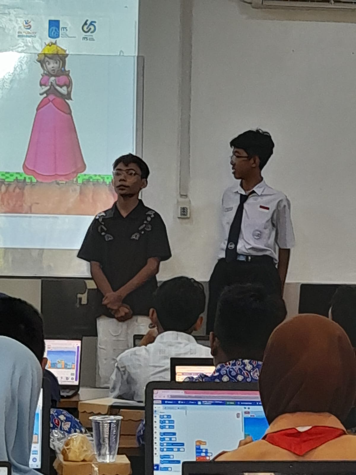 Setelah beristirahat selama 20 menit, peserta diperkenalkan salah satu dosen ITS, Pak Dimas. Beliau mengajarkan siswa bagaimana cara AI memahami input (prompt / media) yang kita beri. Ternyata, setelah kita memberi input, AI akan menganalisa, mencocokkan jutaan data yang serupa dengan input kita, dan mengeluarkan output yang sesuai. Setelah pemberian materi, Pak Dimas mengajak peserta untuk belajar coding sambil memvisualisasikannya dengan aplikasi scratch. Di akhir sesi, Pak Dimas memberi misi kepada peserta untuk membuat game Mario sederhana yang akan dipresentasikan oleh 4 anak. Tim Sanmar menjelaskan fungsi dari beberapa perintah dalam deret coding.