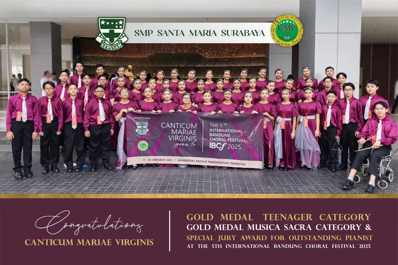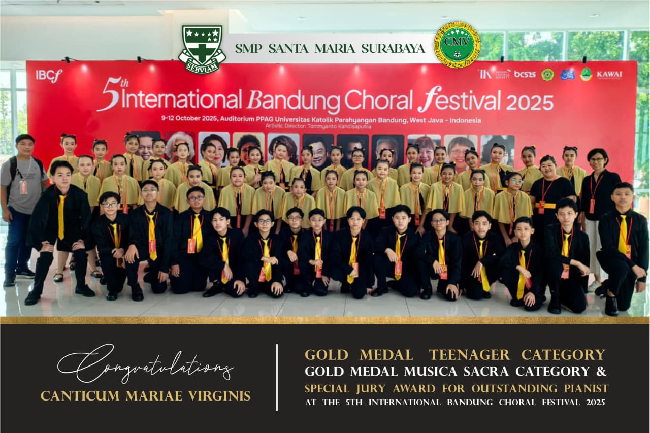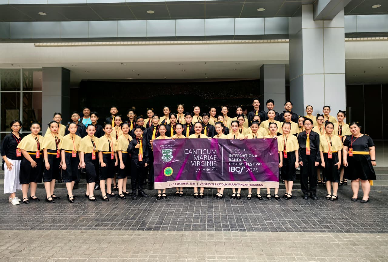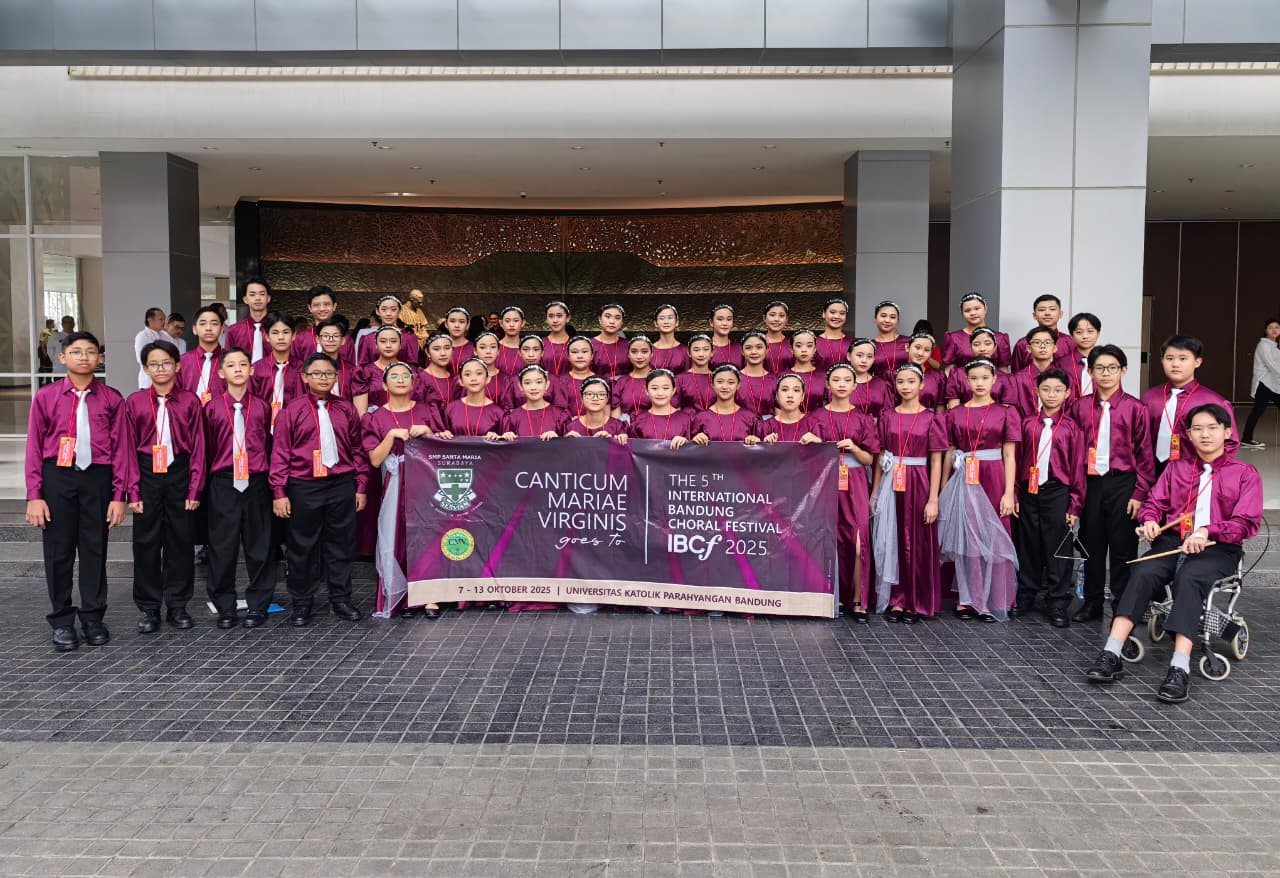 Surabaya, Kampus Ursulin - Sanmaris. Tim Paduan Suara Canticum Mariae Virginis (CMV) SMP Santa Maria berpartisipasi dalam ajang perlombaan International Choral Bandung Festival pada tanggal 07-14 Oktober 2025. Kami berkumpul di Stasiun Gubeng selasa malam dengan suasana tidak sabar. Sesampainya di Bandung, kami pergi ke hotel untuk beristirahat. Siangnya, kami mulai berlatih untuk persiapan lomba dengan serius dan setelah latihan kami langsung pergi ke Universitas Parahyangan untuk uji coba panggung. Walaupun hanya uji coba panggung, namun perasaan kami gugup. Sesudah uji coba panggung, kami beristirahat dan di malam hari kami lanjut latihan untuk mempersiapkan ajang perlombaan